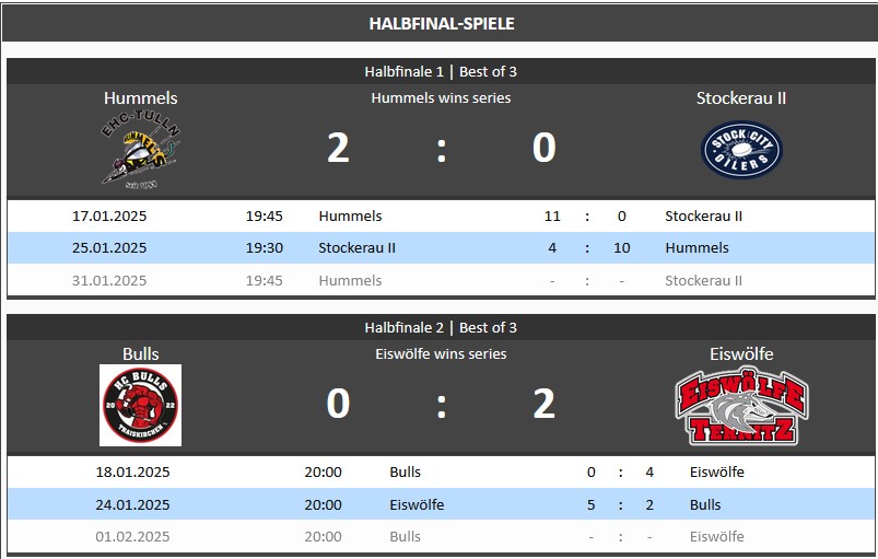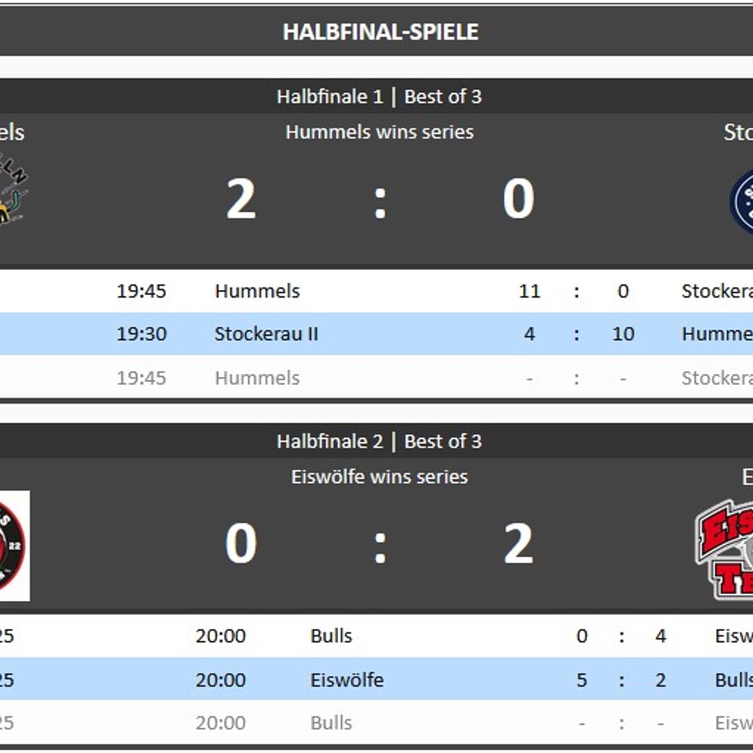 Die Halbfinalpaarungen der NÖ-Landesliga 1 brachten deutliche Entscheidungen: Sowohl der Titelverteidiger, die Eiswölfe aus Ternitz, als auch die Hummels aus Tulln konnten sich gegen die Traiskirchner Bulls bzw. Stockerau mit Siegen in den ersten beiden Spielen klar durchsetzen.